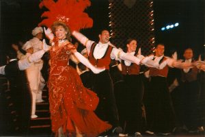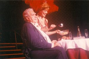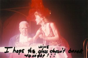 During the Turkey scene I raised my wine glass and when I went to put it down, to hard on the table I think, the stem broke off. The audience gasped. The scene stopped. The kids backstage were terrific! I stood up and called for the waiter to bring me a new glass. One of the dancers danced his way on stage with a tray and a new wine glass. Handed it to me, took a bow and the audience applauded him. Such fun!!!