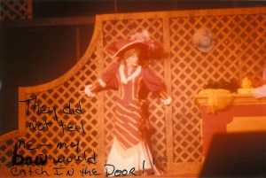 I got my bow caught in the closet door when Cornelius Hackl raced to hide from Horace in the hat shop. I couldn’t move from the door. Jack Dabdoub (Horace) rolled his eyes laughing watching the scene as I tried to break free.
